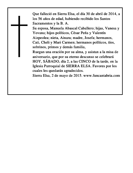 Ruegan una oración por su alma, y asistan a la misa de aniversario, que por su eterno descanso se celebrará HOY, SÁBADO, día 2, a las CINCO de la tarde, en la Iglesia Parroquial de SIERRA ELSA. Favores por los cuales les quedarán agradecidos.