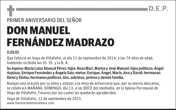 Ruegan una oración por su alma y asistan a la misa de aniversario que, por su eterno descanso, se celebrará MAÑANA, DOMINGO, día 13, a las DOCE del mediodía, en la Iglesia Parroquial de Vega de Villafufre. Favores por los cuales les quedarán agradecidos.