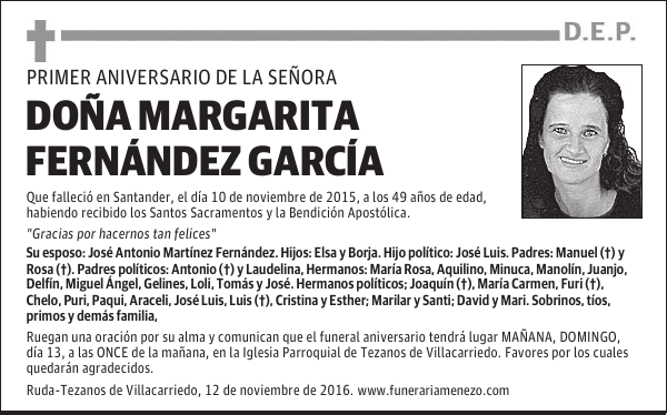 Ruegan una oración por su alma y comunican que el funeral aniversario tendrá lugar MAÑANA, DOMINGO, día 13, a las ONCE de la mañana, en la Iglesia Parroquial de Tezanos de Villacarriedo. Favores por los cuales quedarán agradecidos.