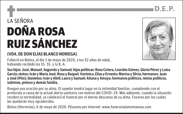 Ruegan una oración por su alma. El sepelio tendrá lugar en la intimidad familiar, cumpliendo con el protocolo a causa de la actual alerta sanitaria con motivo del COVID-19. Más adelante, cuando la situación recobre la normalidad, se celebrará el funeral por el eterno descanso de su alma. Favores por los cuales les quedarán muy agradecidos.