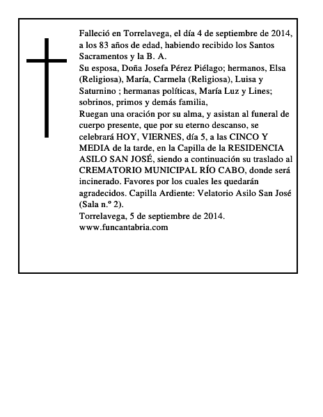 Ruegan una oración por su alma, y asistan al funeral de cuerpo presente, que por su eterno descanso, se celebrará HOY, VIERNES, día 5, a las CINCO Y MEDIA de la tarde, en la Capilla de la RESIDENCIA ASILO SAN JOSÉ, siendo a continuación su traslado al CREMATORIO MUNICIPAL RÍO CABO, donde será incinerado. Favores por los cuales les quedarán agradecidos. Capilla Ardiente: Velatorio Asilo San José (Sala n.º 2).