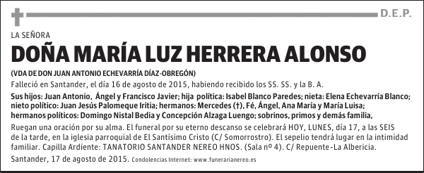 Santander, 17 de agosto de 2015. Condolencias Internet: www.funerarianereo.es