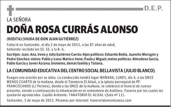 Santander, 3 de mayo de 2015. Pésames por Internet:funerarialamontanesa.com