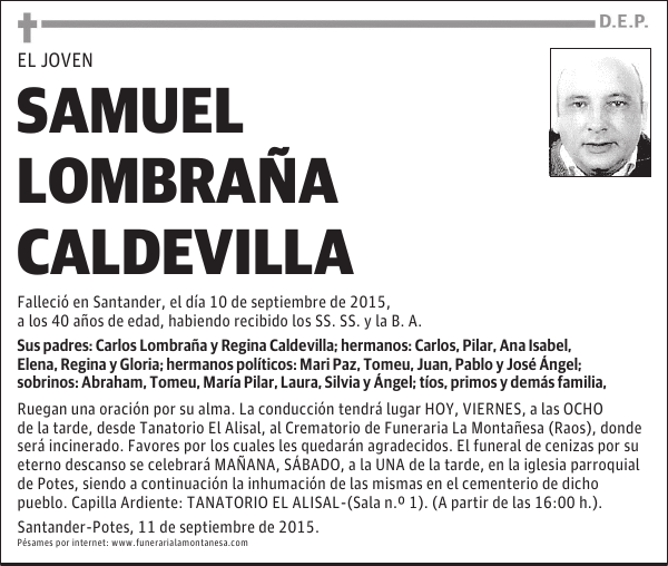 Santander-Potes, 11 de septiembre de 2015. Pésames por internet: www.funerarialamontanesa.com
