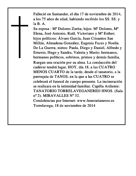 Ruegan una oración por su alma. La conducción del cadáver tendrá lugar, HOY, día 18, a las CUATRO MENOS CUARTO de la tarde, desde el tanatorio, a la parroquia de TANOS, en la que a las CUATRO se celebrará el funeral de cuerpo presente. La incineración se realizara en la intimidad familiar. Capilla Ardiente: TANATORIO TORRELAVEGANEREO HNOS. (Sala nº 2). MIRAVALLES Nº 32.